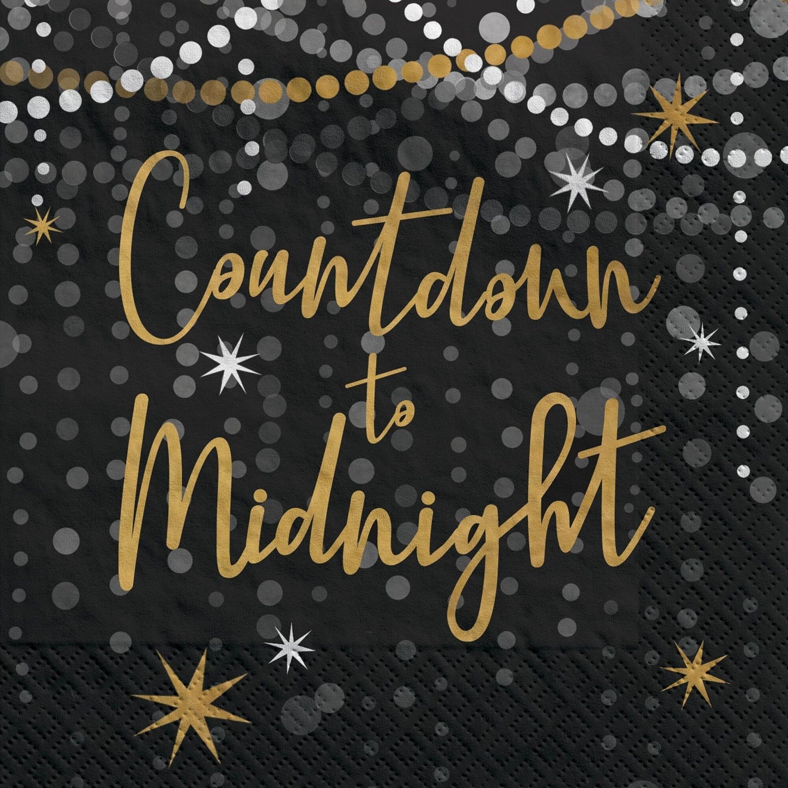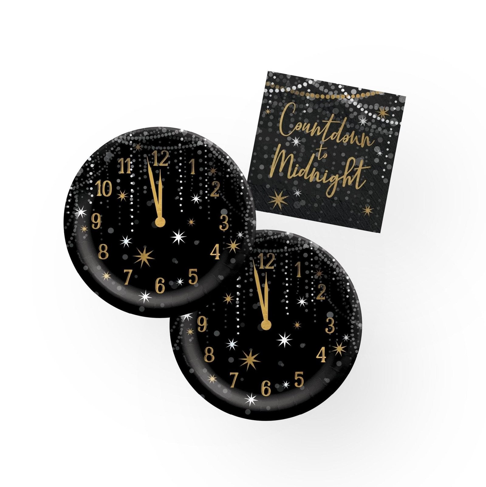Celebrate the arrival of the New Year in style with our black and gold paper plates and napkins! The plates feature an elegant clock design counting down to midnight, while the coordinating napkins showcase “Countdown to Midnight” in gold lettering surrounded by grey and white polka dots on a black background. Perfect for adding a glamorous touch to your New Year’s Eve party, these disposable essentials are both stylish and sturdy. Make your celebration effortless and unforgettable with these chic party supplies that set the tone for a spectacular year ahead.