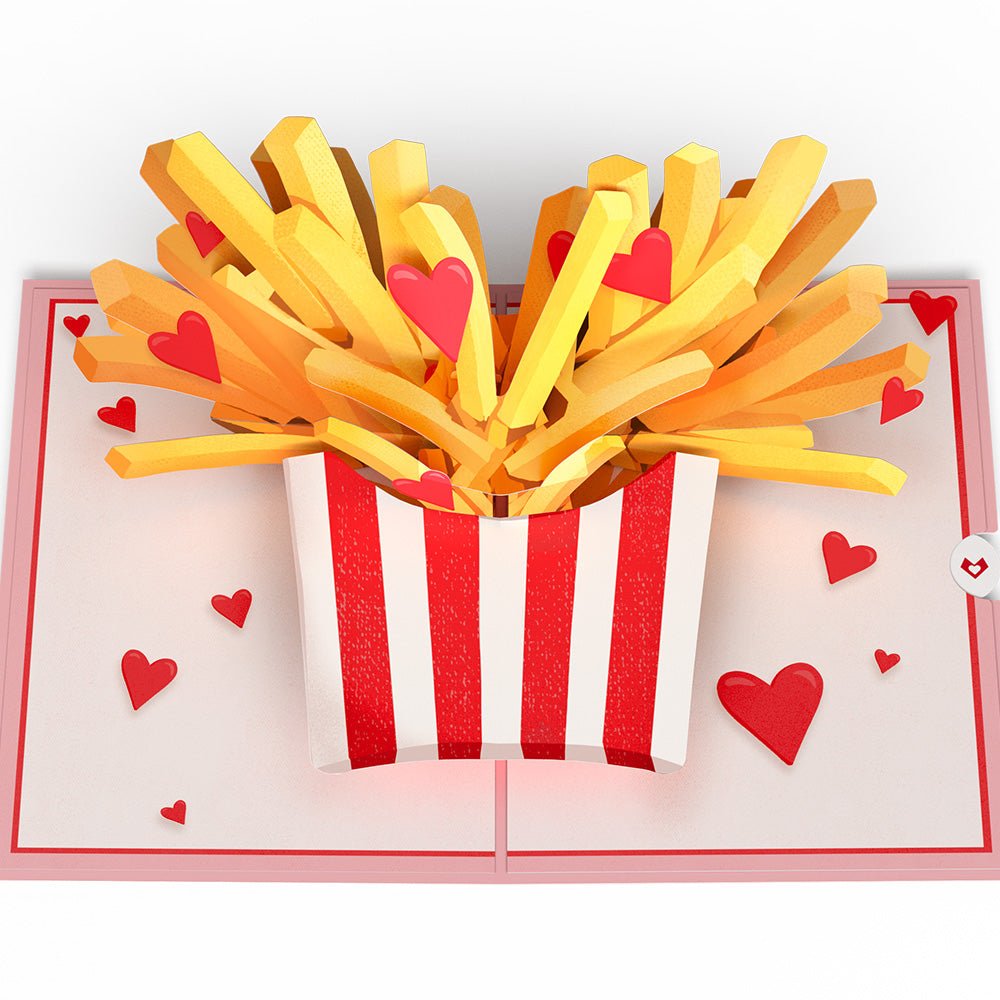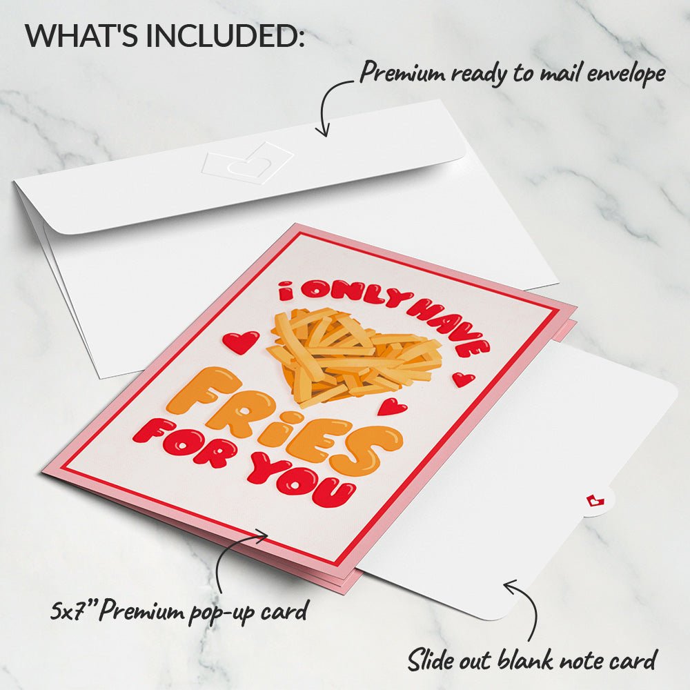 Description: Show your love with this playful pop-up card featuring a heartfelt message, “I Only Have Fries for You,” on the cover with a heart made of fries. Inside, a vibrant 3D design of a striped french fry container bursts with paper fries and scattered red hearts, adding a fun and romantic touch. Perfect for your spouse or partner on Valentine’s Day, anniversaries, or any day you want to show love!