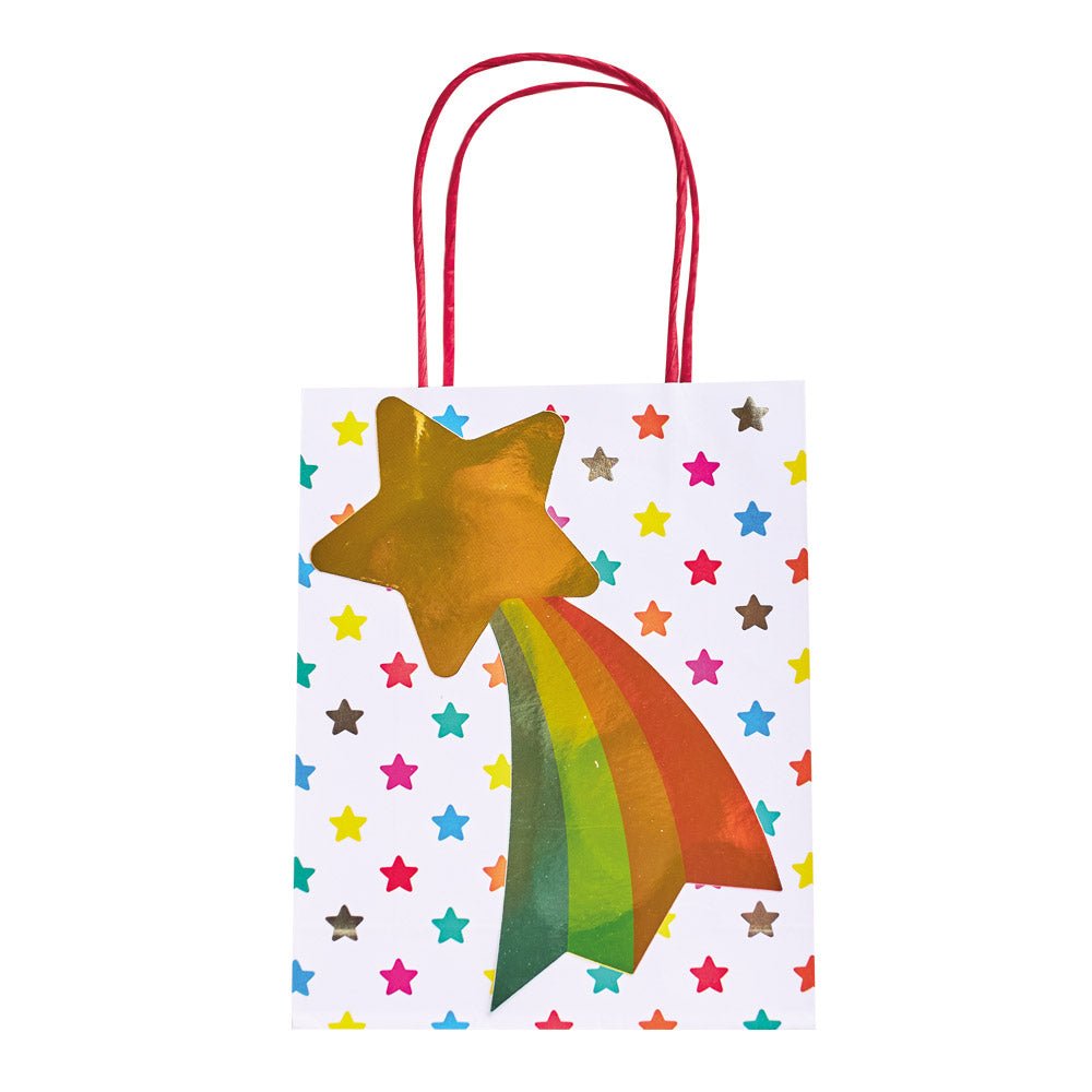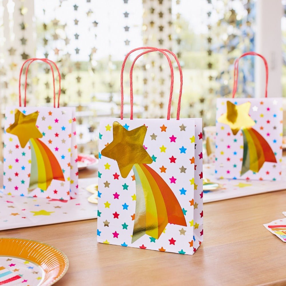 Spoil your party guests with these stunning star treat bags that have been exclusively designed by Party Pieces. Each treat bag features a fun rainbow and luxurious gold foil star print along with a beautiful shiny rainbow mirror board finish shooting star on the front with elegant red twine handles. Fill with a selection of small gifts or toys from our ready to hand one out to each guest at the end of your celebration, or use to decorate your party table! Our simple wrap band packaging keeps packaging to a minimal to help the environment.