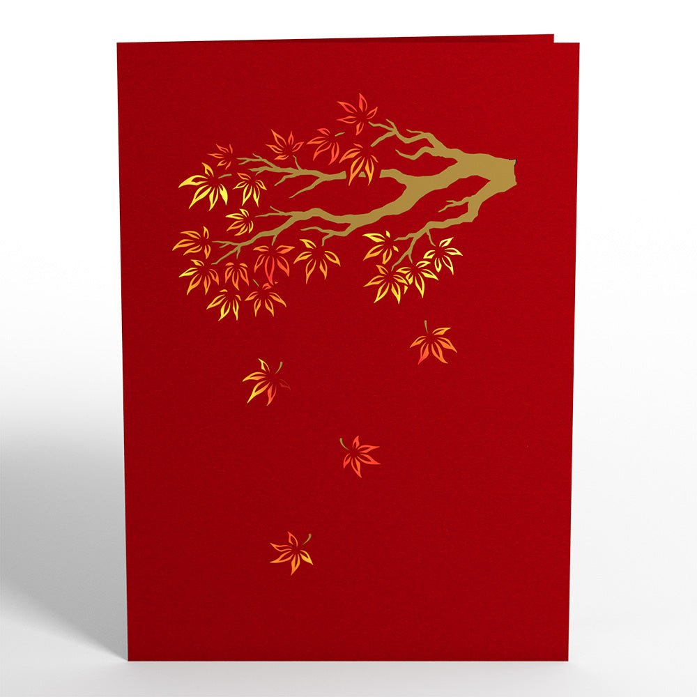 The cover of this beautiful pop-up card is red and adorned with an illustration of the branch of a Maple Tree just starting to shed its leaves. Once opened, an intricate Sugar Maple Tree is pops up from the center. As the fall season sets in, the leaves have turned a gorgeous array of yellow and orange. The card’s inner panels are embellished with laser-cut maple leaves.