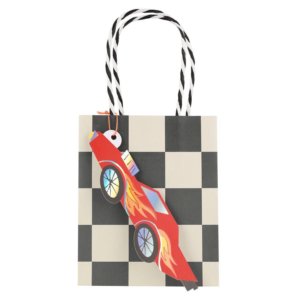 - Checked paper bags with a tag that doubles up as a sticker, attached with a neon orange cord